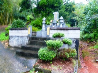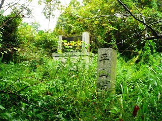 「日輪寺山」から下山して国道3号線を少し北上して平山温泉に向かいます。「新村」の交叉点から右に折れます。日帰り温泉からいろいろな温泉が あります。しばらくで「平山阿蘇神社」が左にあります。ここに平山城址への案内標識がありますが、私は「肥後の山675座駈け歩き」にある西福寺跡方面から登ることにしていたので、さらに走ります。御影石の標識がある狭い車道に左折します。さらに進むと右側に熊野座神社です。この先で左へ上る林道を走ります。峠から少し下ると右側に墓地があります。この辺りが広いので駐めました。雨もだいぶ降っています。