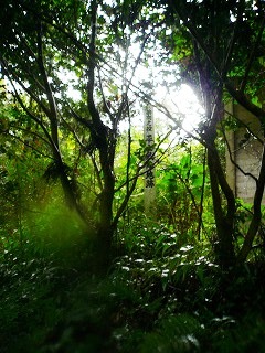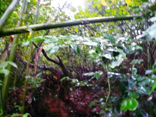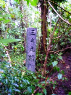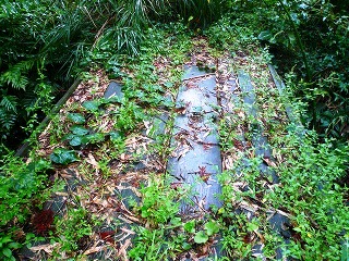 ここは西南戦争の激戦地跡のようです。 さらに進めば三の丸です。 雨具を付けて、ここから右へのコンクリート道を上るとすぐに舗装は切れて車止めがあります。左は手入れされた竹林です。作業道には夏草が茂り下っていきます。作業道が高くなったところで左に入る踏跡に入ります。夏草が茂っていますが、何となくわかります。ここから竹が生えているところもあり夏草が茂っています。なんとなくある踏跡をたどります。樹林に入ると草はありませんが、倒木などもあります。テープなどは全然ありません。樹林に入ったところで踏跡が右方向へ変わるので 、こちらに歩くとカヤトの茂った所に到着です。ここで御影石の標柱を見ました。ようやく本丸の跡です。カヤトの倒れている踏跡を少し歩くとありました。さらに立派に城址跡の石碑がありました。過去には手入れがなされていたのでしょう。さらに踏跡をたどると堀切があり橋が架かっています。大分朽ちていますが、歩けます。これを渡りさらに堀切の橋を渡ると二の丸です。すぐに右側から作業道があがってきています。この道を使うのが楽かもしれません。これをすぎるとお堂が建っています。この辺りは西南戦争時の戦場でもあったようです。さらに進むと三の丸跡の石柱が立っていました。お堂の近辺に三角点はあるらしいのですが、周囲は夏草が茂ってわかりませんでした。ここから往路を戻りました。