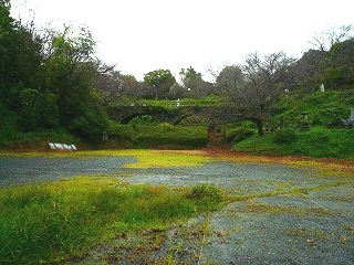 駐車場から見た移築された石橋です。 四十七士の遺髪の塔